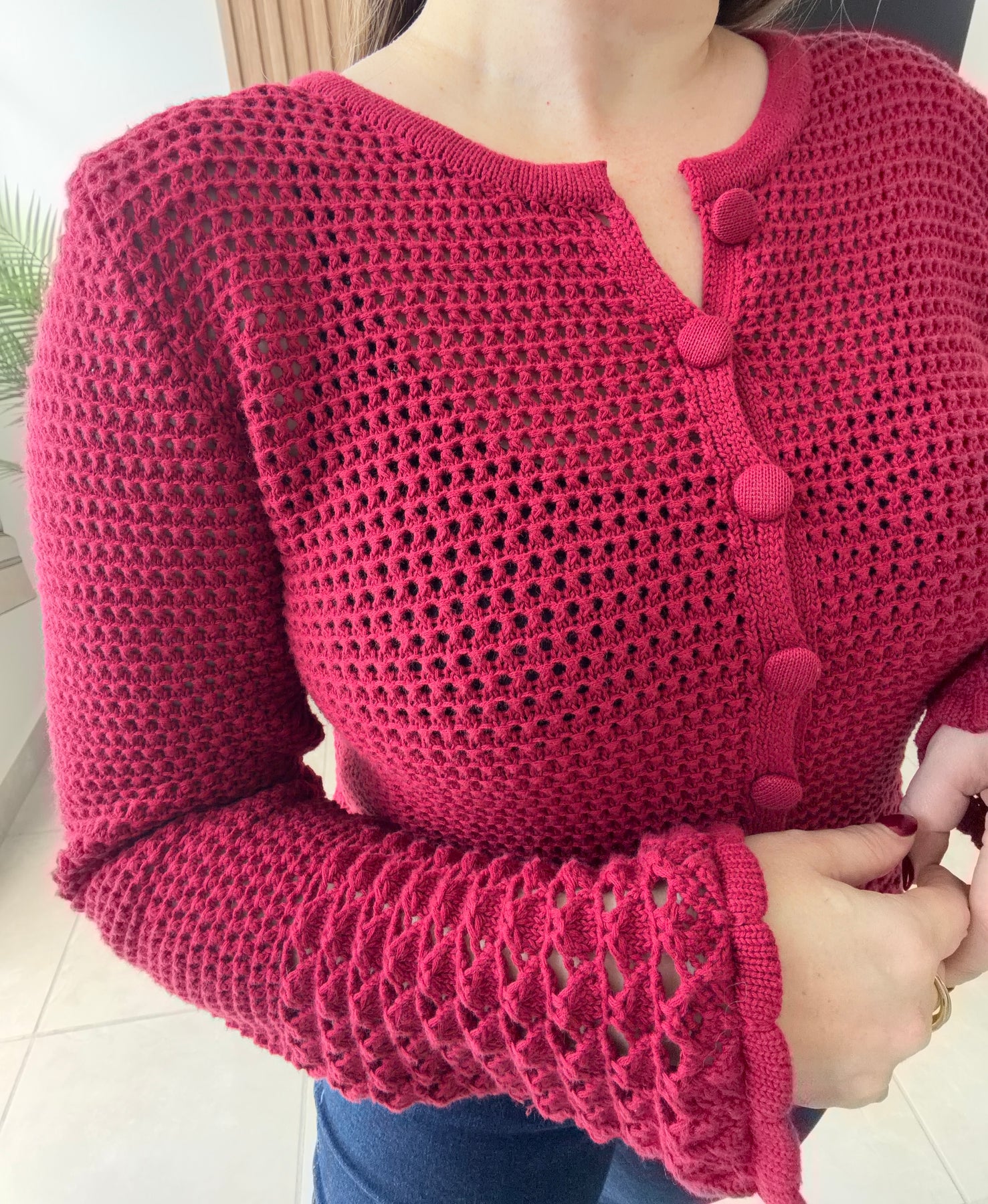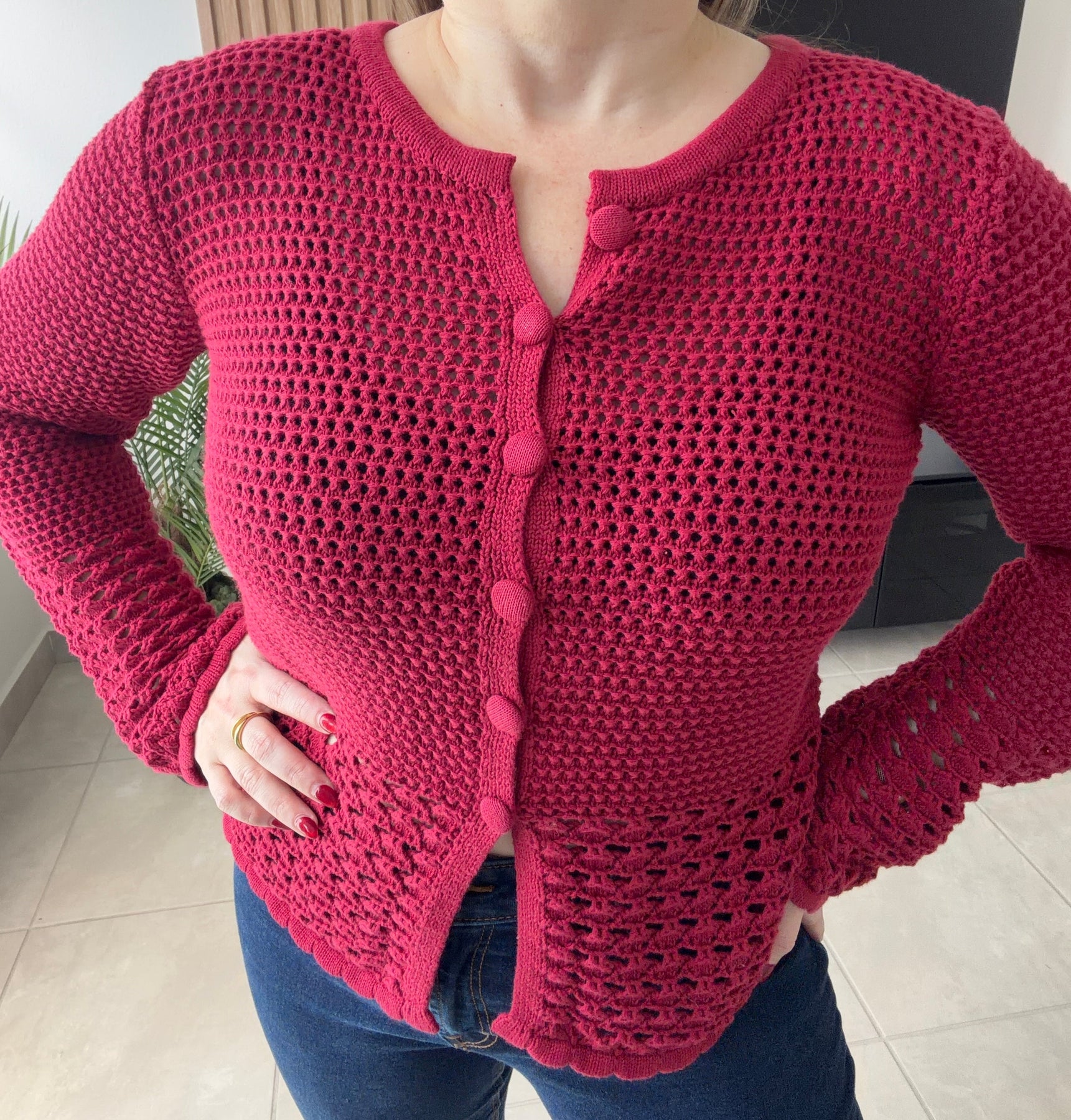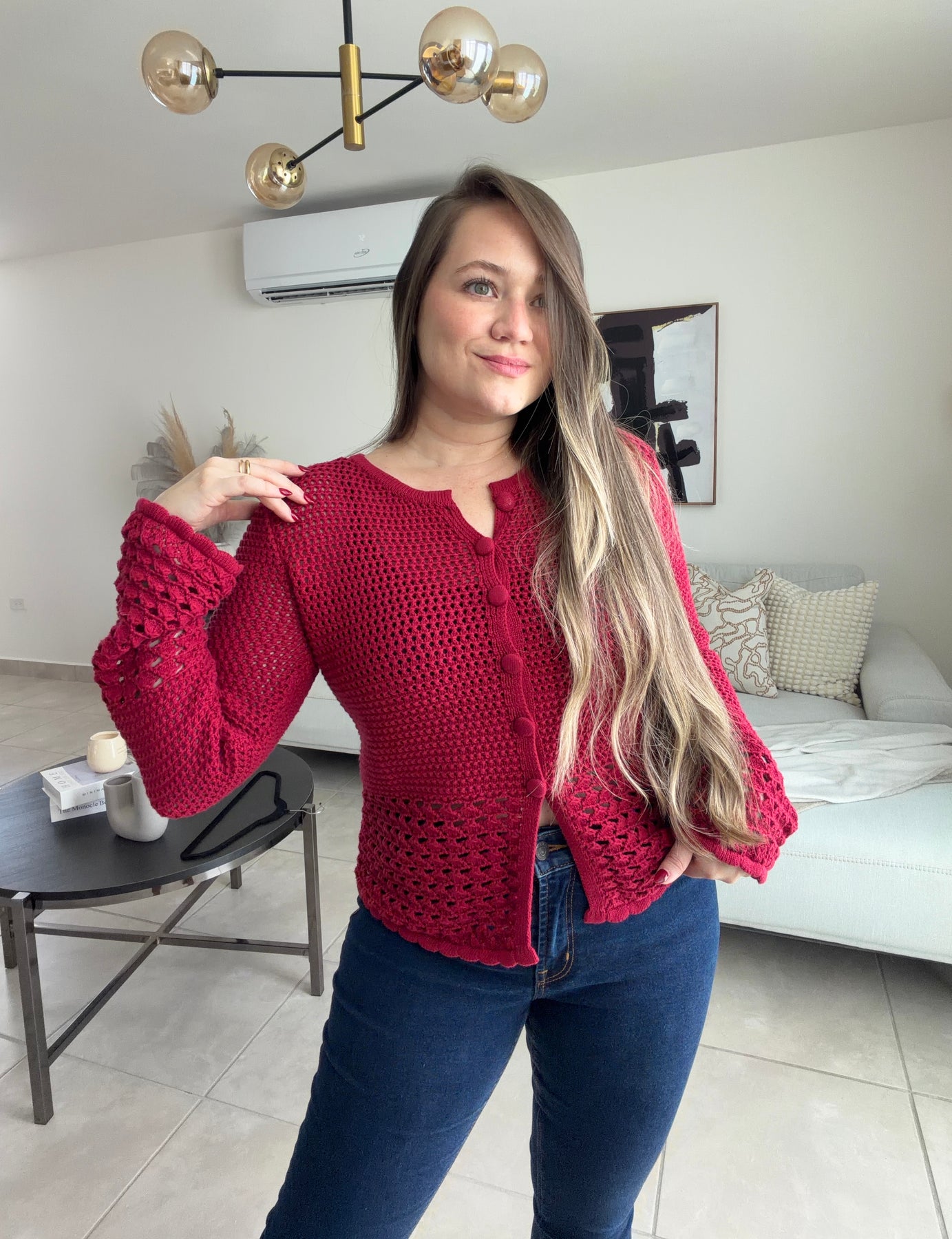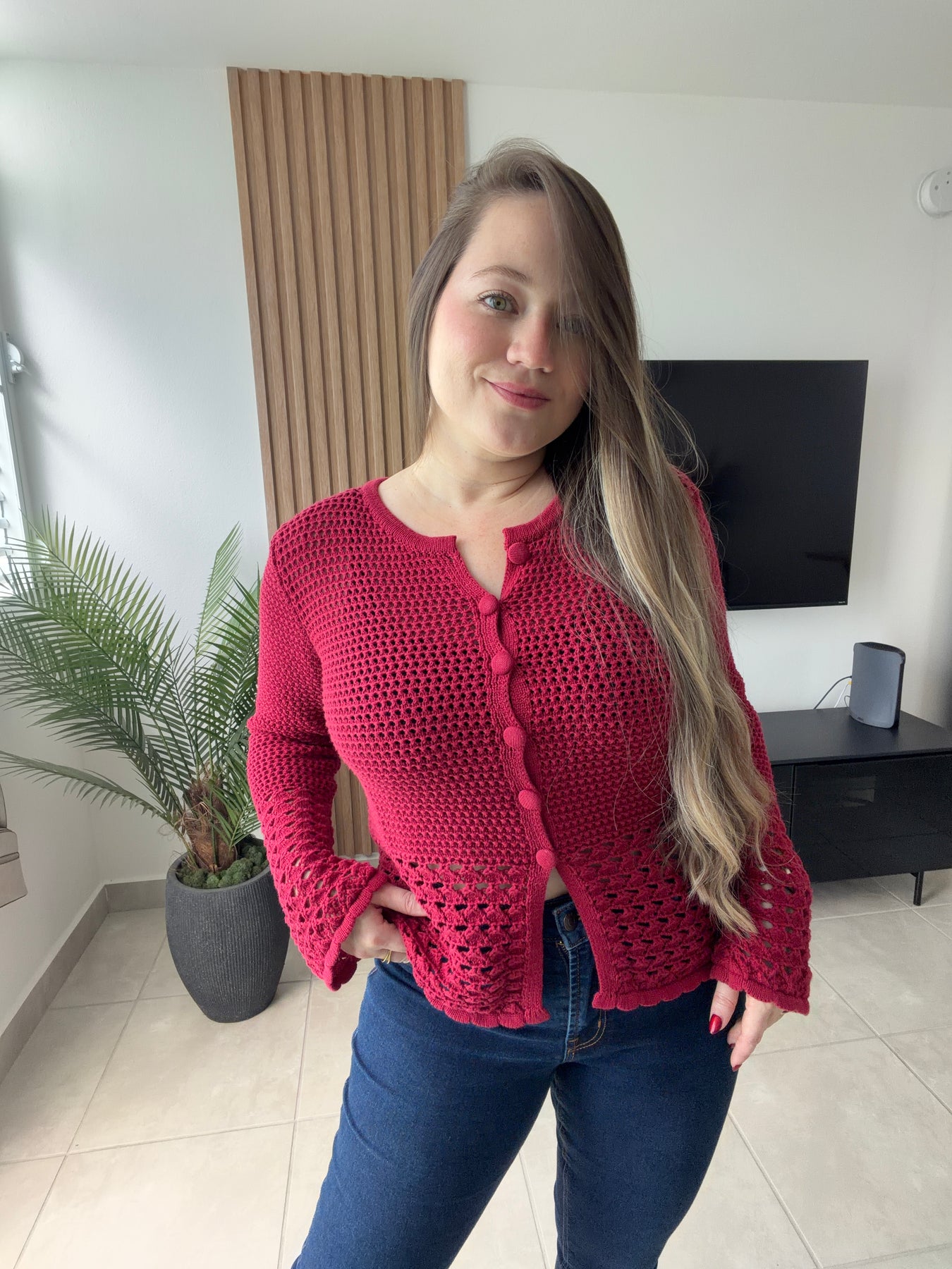 Su tela es tejida estilo crochet, por lo que tiene pequeños agujeros por todo el cardigan, asi que recomiendo llevar un brasier color nude, negro o color parecido al cardigan.