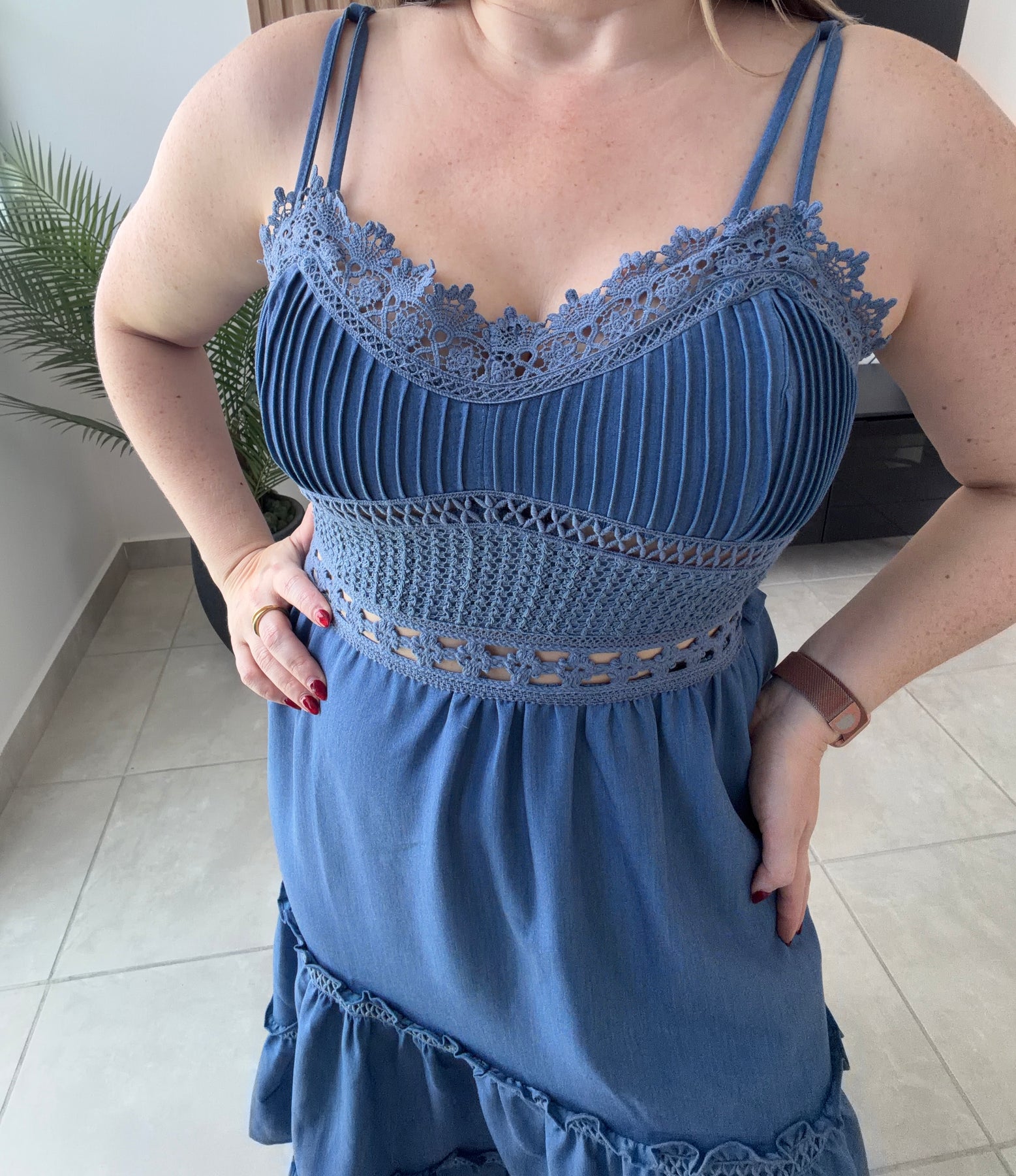 Tiene areas tejidas en crochet, dandole un toque delicado.