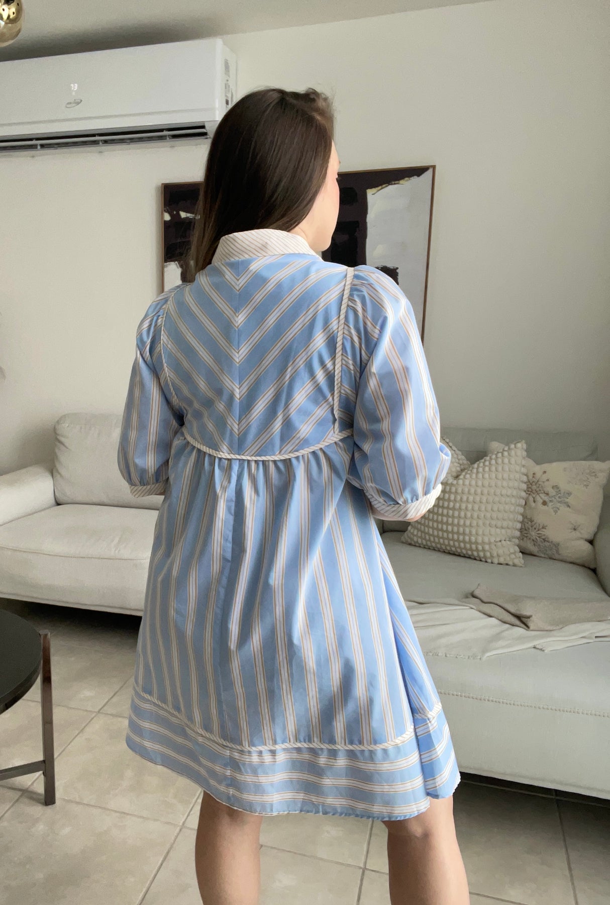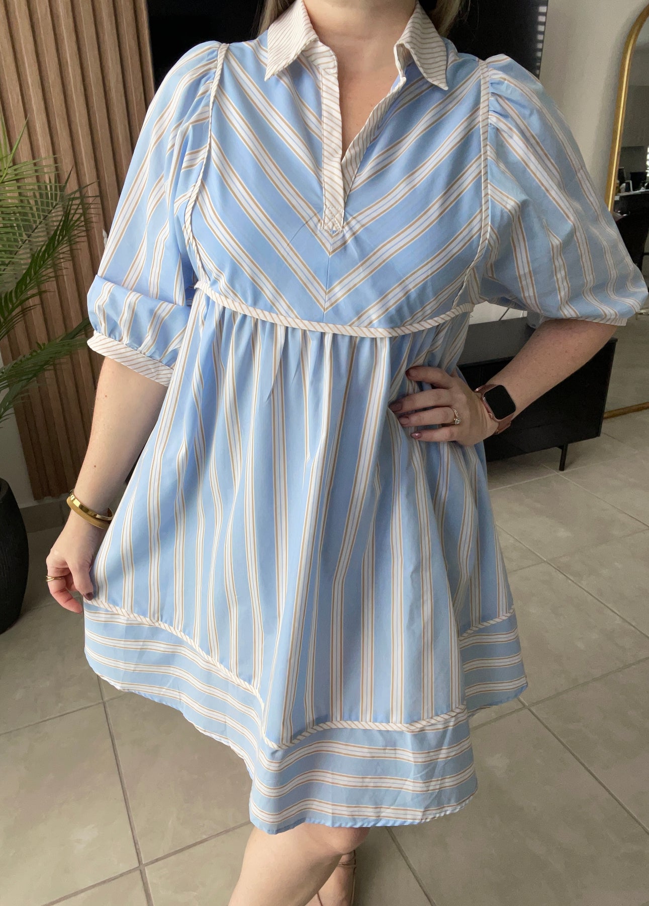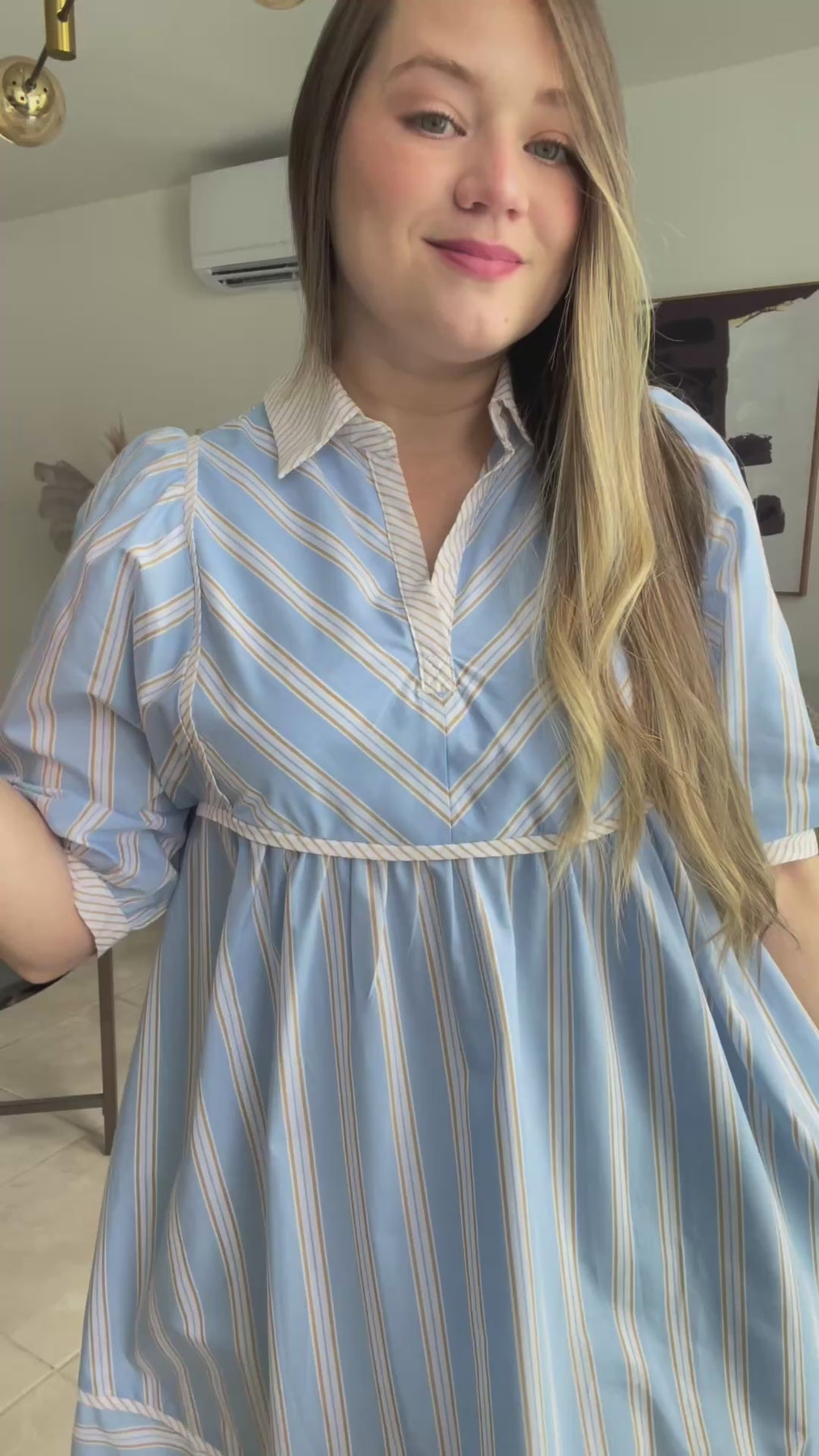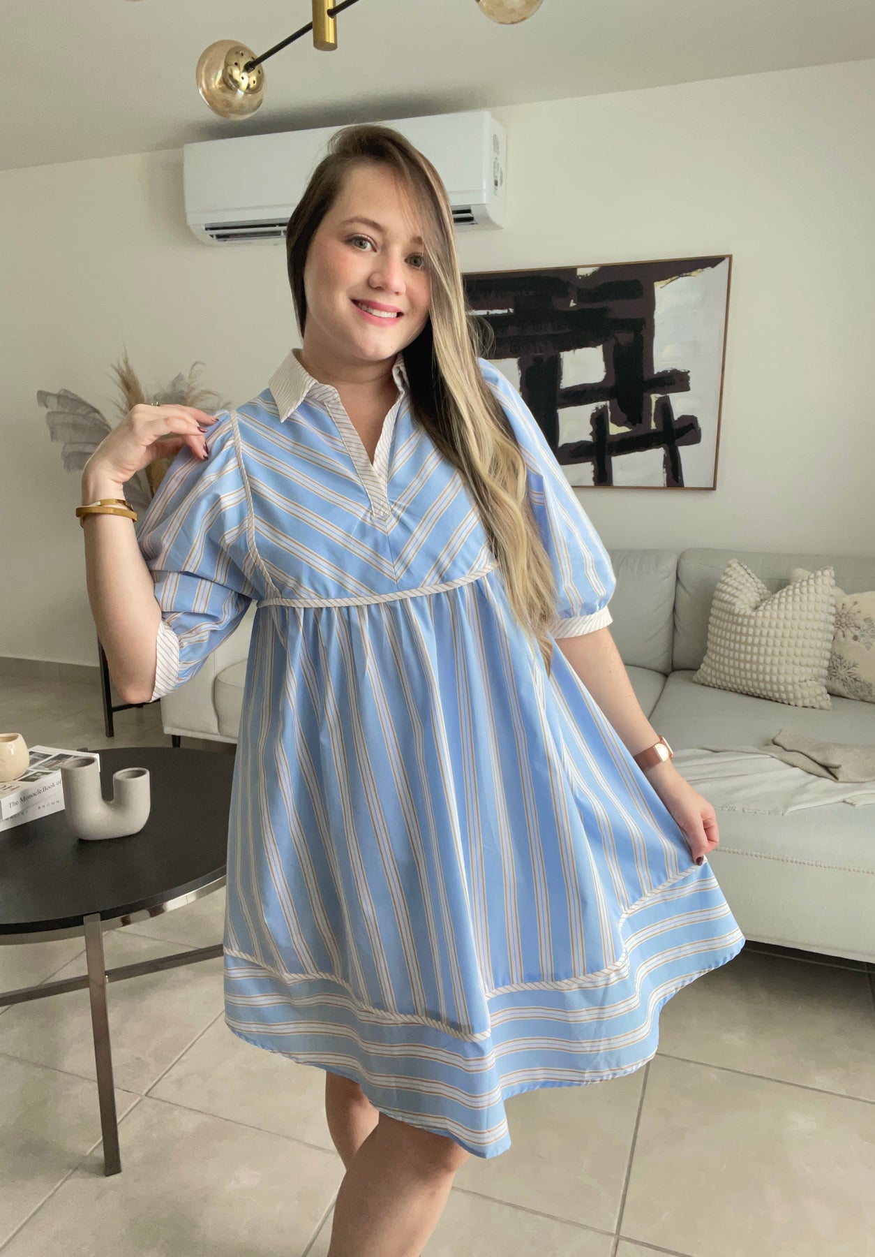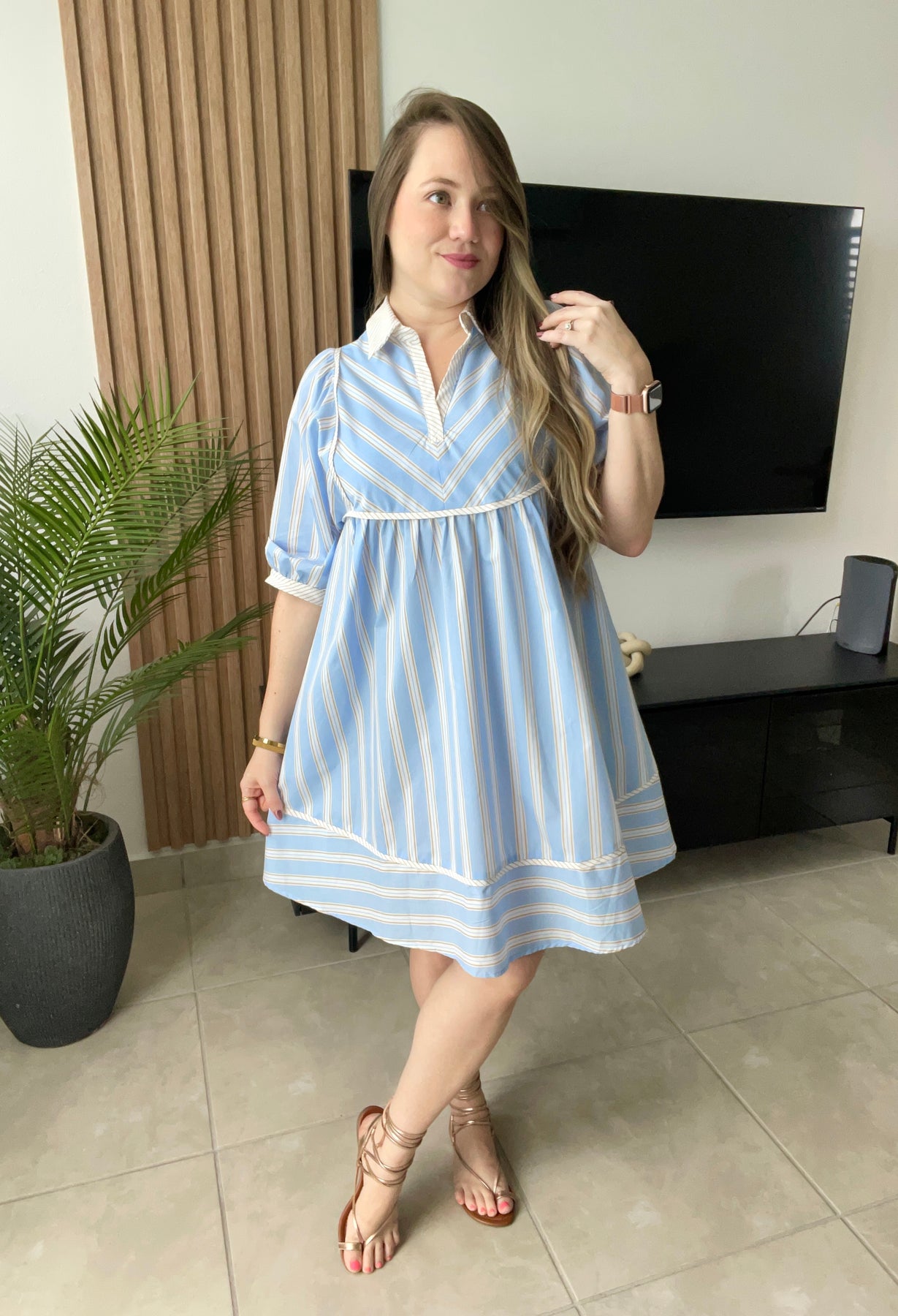 Aunque cae anchito, tomolo a tu size regular dado a que costura debajo del busto no estira. Tela del vestido no estira
