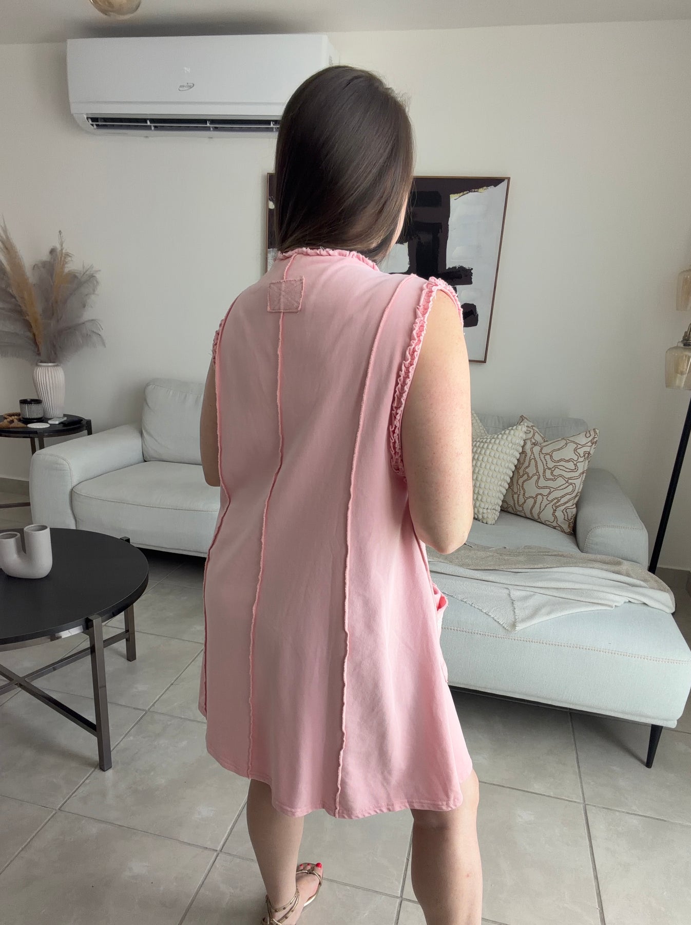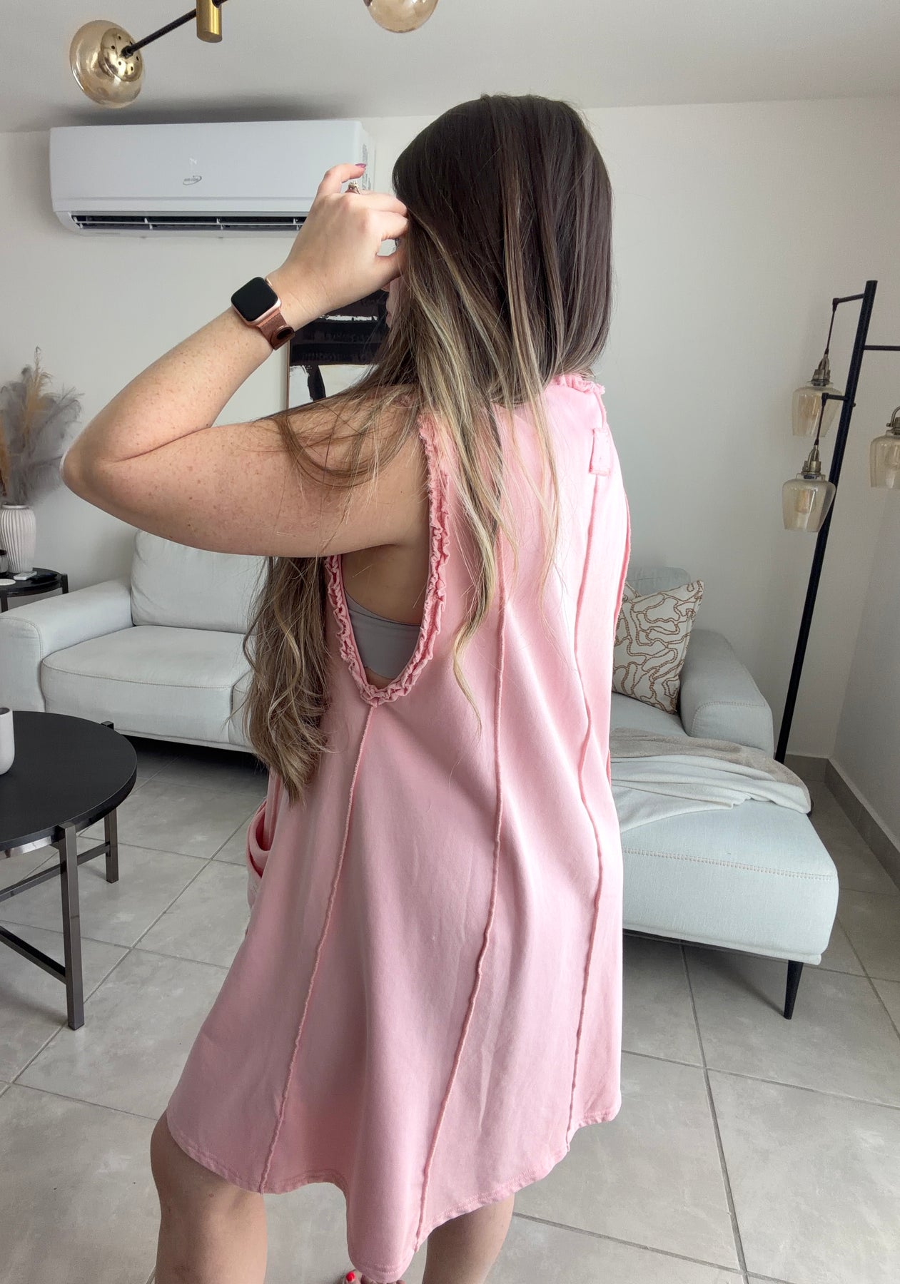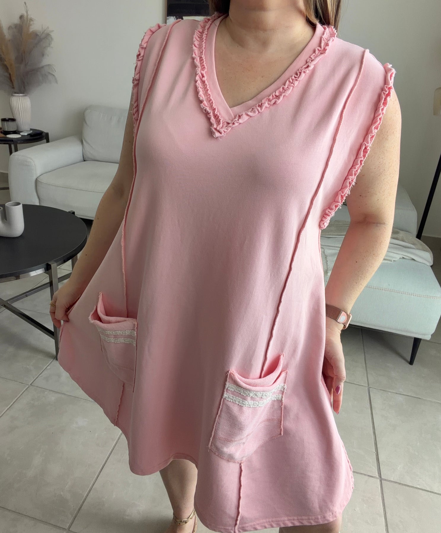 Tela tiene un poco de stretch. Area de las mangas es ancha, por lo que se ve un poco el bracier o lo que lleves puesto por debajo.